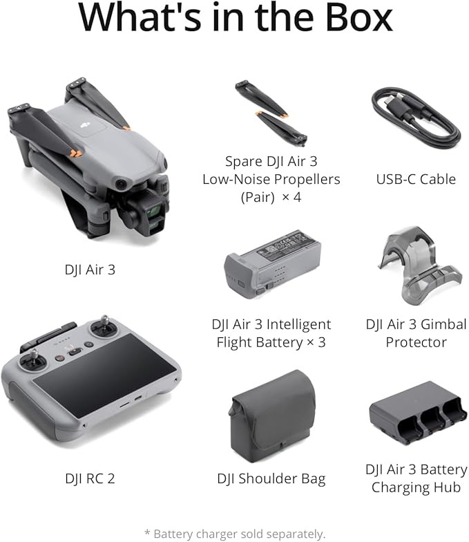 | Included components | DJI Air 3 x 1, DJI RC 2 x 1, DJI Air 3 Battery Charging Hub x 1, DJI Shoulder Bag x 1, USB-C Cable x 1, DJI Air 3 Intelligent Flight Battery x 3, Spare DJI Air 3 Low-Noise Propellers (pair) x 4, DJI Air 3 Gimbal Protector x 1 |