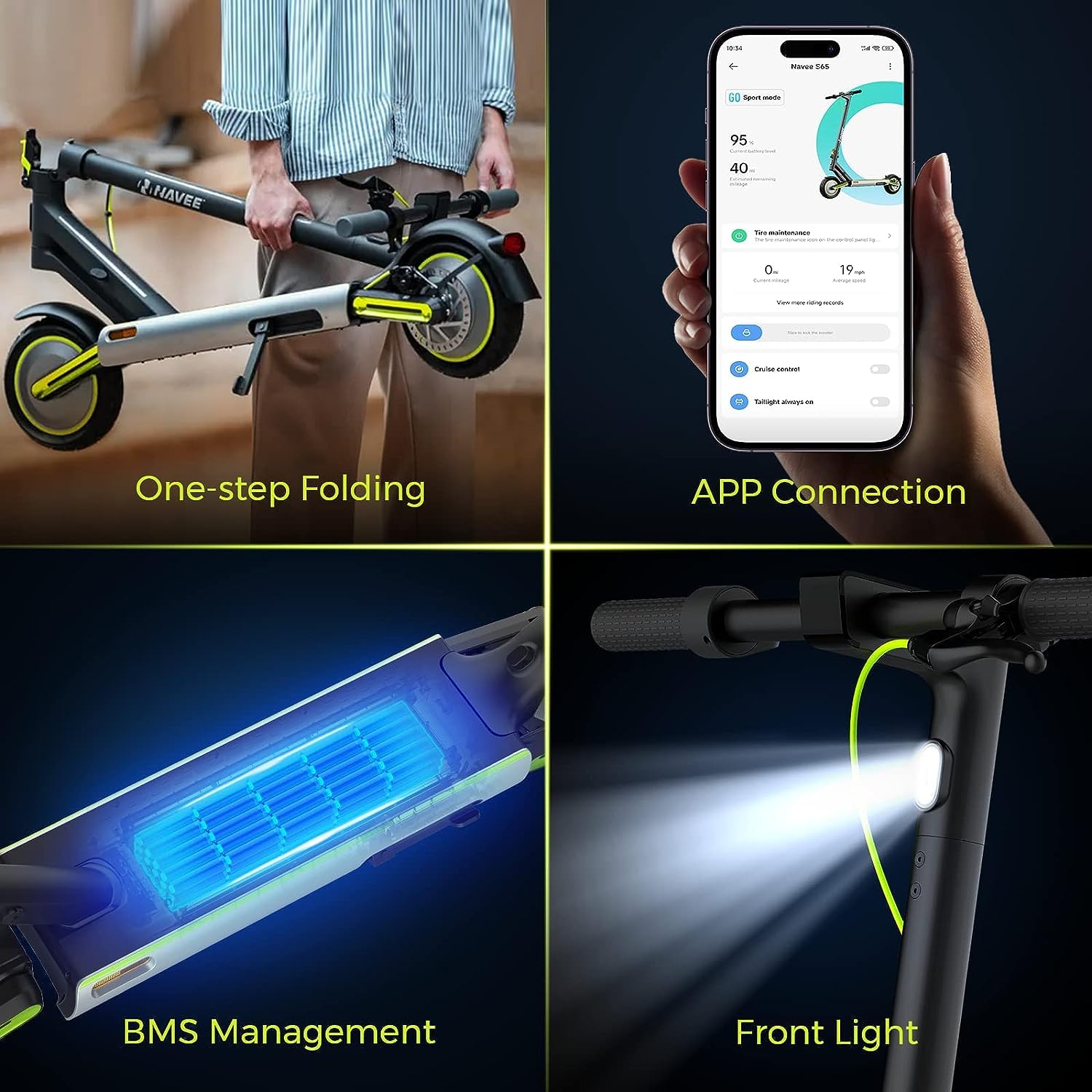 - 🛴【Dual Suspension System】:NAVEE Electric Scooter S65 is engineered with advanced front and rear dual suspension system to deliver unmatched comfort and stability on any terrain. Whether you’re riding on rough roads, uneven pavements, or bumpy trails, the S65 will provide you with a smooth and comfortable riding experience.