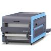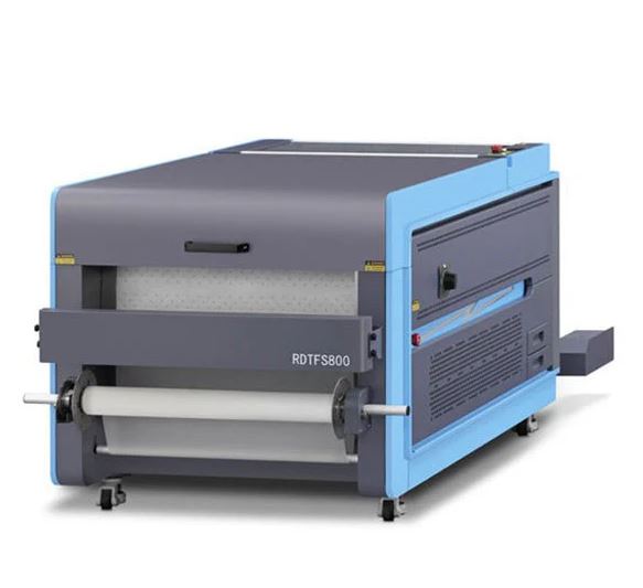 - The film exits the printer and is guided into the shaker unit via the pre-heater platen. Once inside, the printed film undergoes a dusting and powder application process in the powder bin
